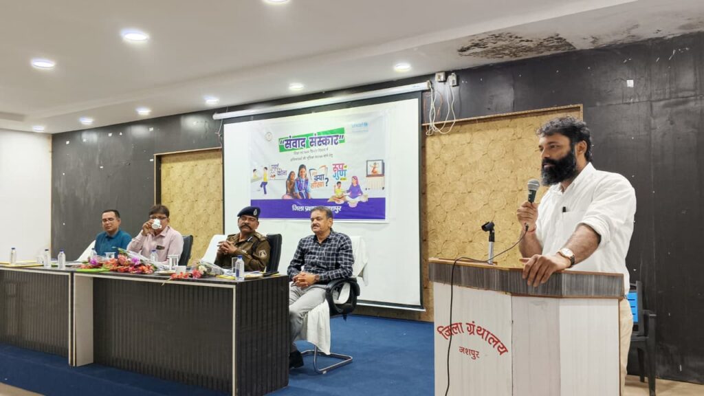 जशपुर। जिला प्रशासन, यूनिसेफ, अलायंस फॉर बिहेवियर चेंज और सर्वहितम के संयुक्त तत्वाधान में जिला सभागार में “संवाद – संस्कार” कार्यक्रम पर एक दिवसीय कार्यशाला का आयोजन जिला कलेक्टर सभागार में किया गया।