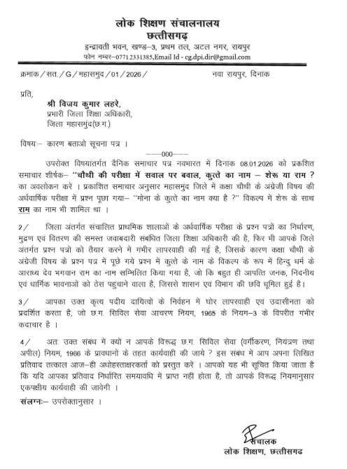 Mahasamund | A major controversy has erupted in Chhattisgarh’s Mahasamund district after a highly objectionable question appeared in the Class IV half-yearly examination conducted in government schools. The English question paper allegedly included the revered name of Lord Ram as an option for a dog’s name, triggering widespread outrage and protests.